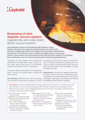 Procesele de degazare a oțelului pot avea cerințe foarte specifice, în funcție de proiectarea instalației, de rutele metalurgice și de calitatea dorită a produsului final. Sistemele mecanice de vid funcționează fiabil la degazerele VD, VOD sau RH cu tonaj mare. Dezvoltarea pompelor de vid moderne cu șurub uscat a crescut capacitățile de proces ale sistemelor mecanice de vid.