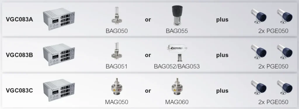 - VGC083A este conceput pentru a fi utilizat cu un capete de manometru cu ionizare pasivă cu catod cald Bayard-Alpert BAG050 (nud) sau BAG055 (închis metalic compact) și două capete de manometru Pirani PGE050 cu convecție îmbunătățită.